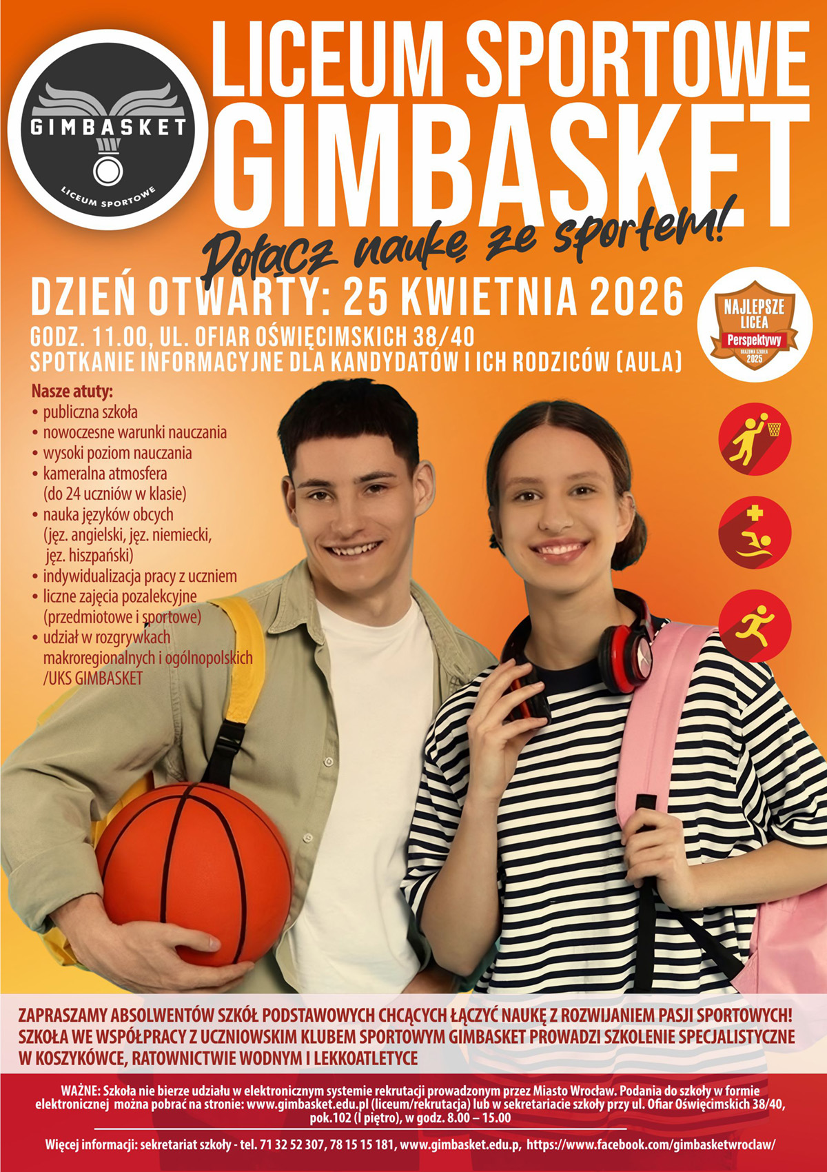 Uczniów – kandydatów do klas 1 Liceum Sportowego GIMBASKET oraz ich rodziców zapraszamy na Dzień Otwarty, który odbędzie się dnia 25 kwietnia 2026 (sobota) w auli Liceum Sportowego GIMBASKET przy ul. Ofiar Oświęcimskich 38/40 o godz.11.00.